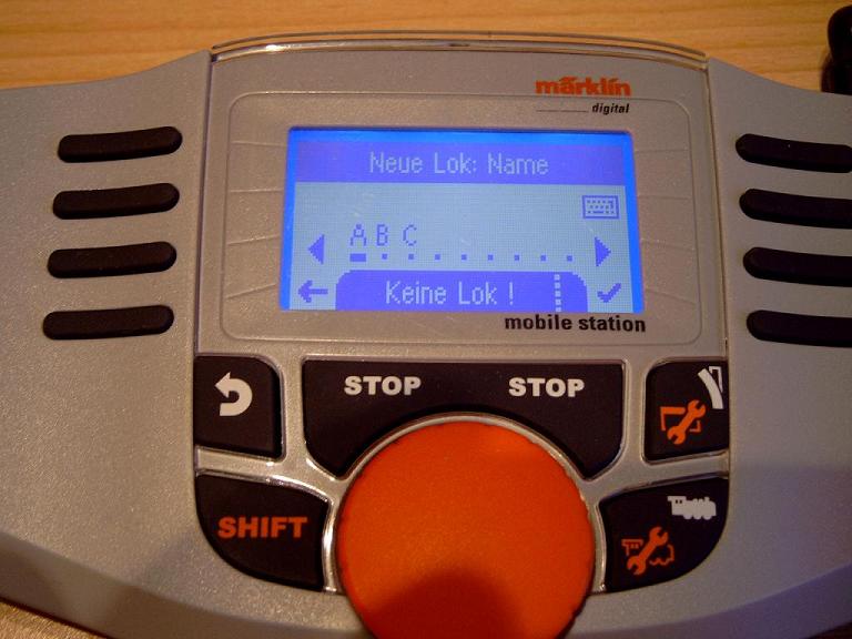 Nun kann man der Lok noch einen Namen zuweisen, der dann im Display angezeigt wird. Die Buchstaben wählt man aus indem man die Taste SHIFT drückt und dabei den Drehregler bewegt. Zur nächsten Stelle gelangt man indem man auf die Taste neben dem Symbol ► drückt, eine Stelle zurück kommt man indem man auf die Taste neben dem Symbol ◄ drückt.
