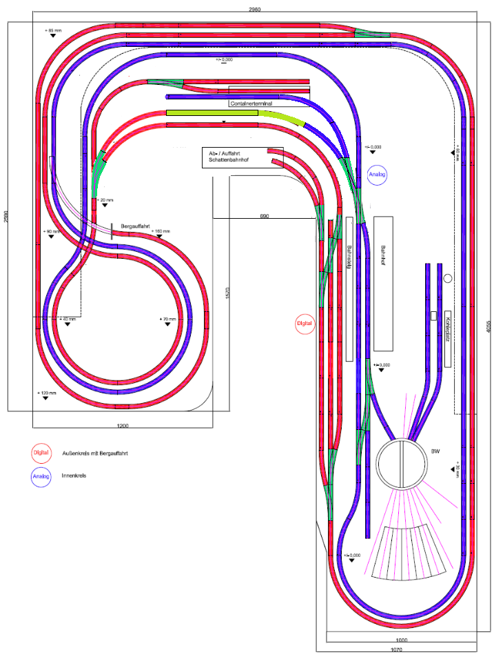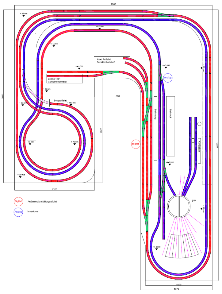 Der Bogen mit dem Systemwechsel wandert auch noch etwas nach Süden. Am westlichen Ende bekommt er eine weitere Weiche (etwas unsauber gezeichnet, gebe ich zu). Diese führt in den (gespiegelten) ehemaligen Container-Bf, der nun auch ein drittes Gleis aus dem blauen (=analogen) Bereich erhält. Dazu muss m. E. die Kreuzungsweiche am Nordende der Bahnhofs-Anlage noch etwas nach Süden verlegt werden.
