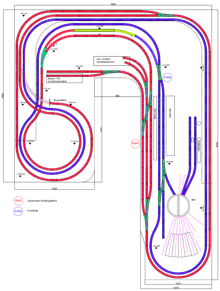 Im Übergang zwischen den beiden Armen sind 2 Gleise durch den Wegfall des digital/analog-Übergangs weggefallen, dafür eines als Zufahrt zum BW dazugekommen. Ohne die Trennung kann auch am Punkt B eine Verbindung der Bergbahn mit beiden Richtungsgleisen erfolgen, bei der bisherigen Planung müsste hier immer eine Falschfahrt stattfinden und ggf. zusätzlich der Zug wenden, wenn er vom Berg kommt. Auch im Bahnhof kann so durchverbunden werden, alle Züge aus beiden Richtungen kommen in den Sbf und aus dem Sbf kommend kann der Bahnhof in beiden Richtungen verlassen werden.