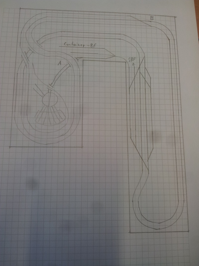 Denkt bitte beim betrachten daran, dass die Gleise hier nicht maßstäblich eingezeichnet sind - der freie Platz hinter dem Bahnhof dürfte wesentlich größer sein. Schließt man den Sbf an das äußerste rechte Gleis an, kann man evtl. sogar eines der linken Gleise noch einsparen. Wer mag, kann diese Idee gerne in Software umsetzen, würde mich freuen zu sehen, ob das maßstäblich umsetzen lässt.