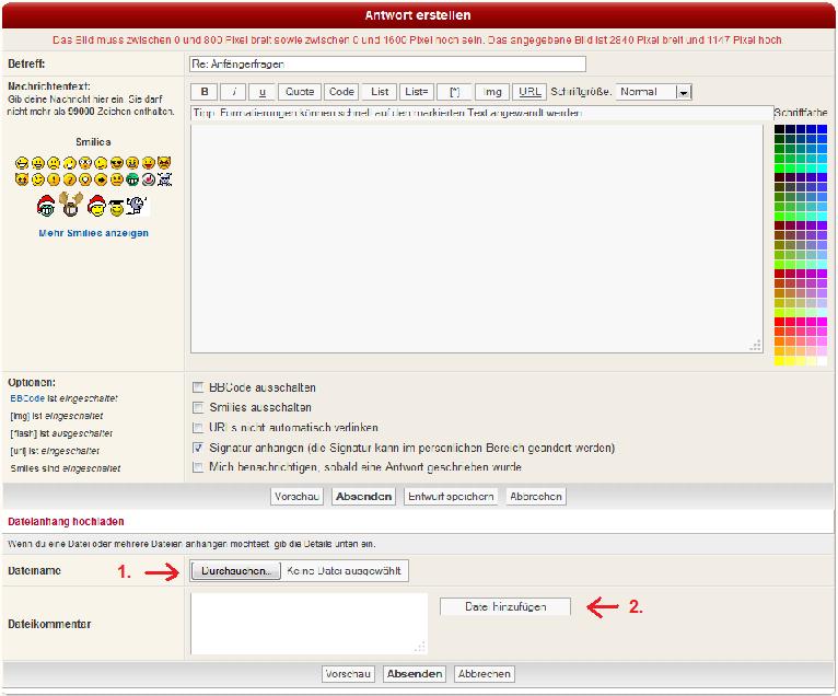 Beim Erstellen der Antwort sieht man unter dem Editorfenster eine Zeile mit dem Namen Dateianhang hochladen. Darunter Dateiname und dahinter den Button Durchsuchen (1.). Darauf klickt man und wählt von seiner Festplatte das Bild aus welches man hochladen will (man kann zwar mehrere Bilder hochladen, aber immer nur eines auf einmal). Ist das gewünschte Bild ausgewählt klickt man auf den Button Datei hochladen (2.) (rechts unterhalb des Buttons Durchsuchen). Die ausgewählte Datei wird nun hochgeladen, dies erkennt man an dem sich öffnenden Fenster. Ist das Hochladen beendet schließt sich das Fenster wieder von selbst. Das Bild darf eine maximale Größe von 800Pixeln Breite und 1600 Pixeln Höhe haben. Ist das gewählte Bild größer wird nicht hochgeladen und es erscheint eine rote Warnmeldung über dem Editorfenster (siehe mein Beispielbild oben). Ist es erfolgreich hochgeladen wird es unten unter Angehängte Dateien angezeigt. Willst Du das Bild nun irgendwo in Deinem Beitrag anzeigen so geht das mit dem Button Im Beitrag anzeigen. Vor dem Button werden die hochgeladenen Bilder in einer Menüleiste angezeigt, als erstes immer das zuletzt hochgeladene Bild. Man wählt also das Bild aus der Leiste aus, positioniert den Cursor an der gewünschten Stelle im Beitrag und klickt dann auf Im Beitrag anzeigen. An der gewüschten Stelle erscheint dann eine Zeile die etwa so aussieht (attachment=0)Bildername.jpg(/attachment), jedoch mit eckigen anstatt runden Klammern. Klickt man dann auf den Button Vorschau wird eine Vorsachau des Beitrages mit dem Bild an der gewünschten Stelle, so wie oben zu sehen, angezeigt. Direkt Bilder einstellen ohne die attachment-Funktion geht nicht.