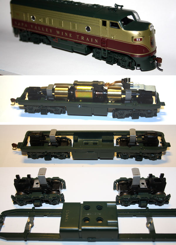 Die "Ready to Roll" und Genesis haben die Stromabnahme über die Drehgestelle. Die vier Schrauben im Tankboden gehen in die Motorenhalterung, welche aus Kunststoff besteht. Diese sollten schon für DCC ausgerüstet sein. Nur noch den Dekoder in der Printplatine einstecken.