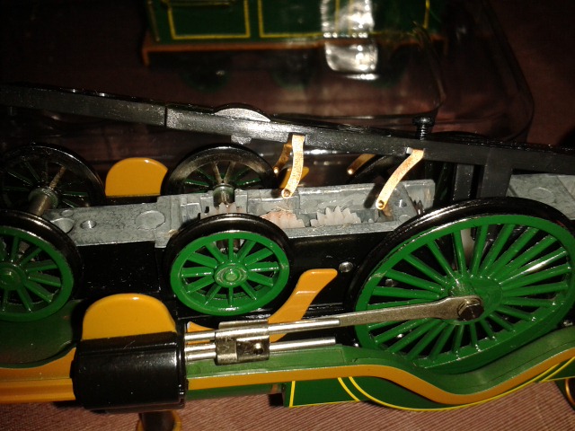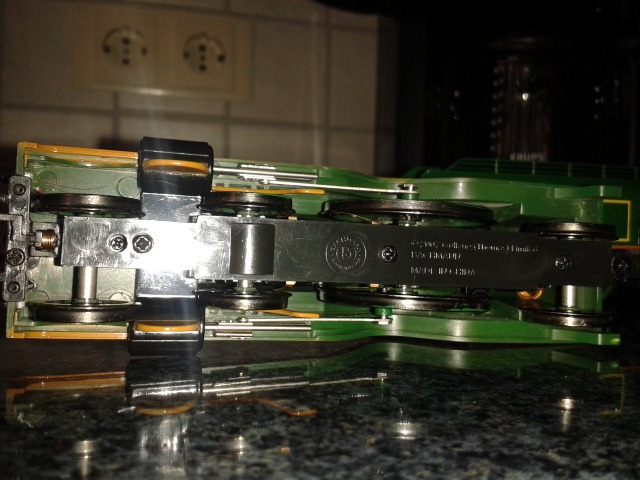 Was mir nach dem Abschrauben der Bodenplatte als erstes aufgefallen ist, ist dass der Strom offenbar an 2 Radsätzen abgenommen wird. Das kann man auf dem letzten Foto auch recht gut sehen.