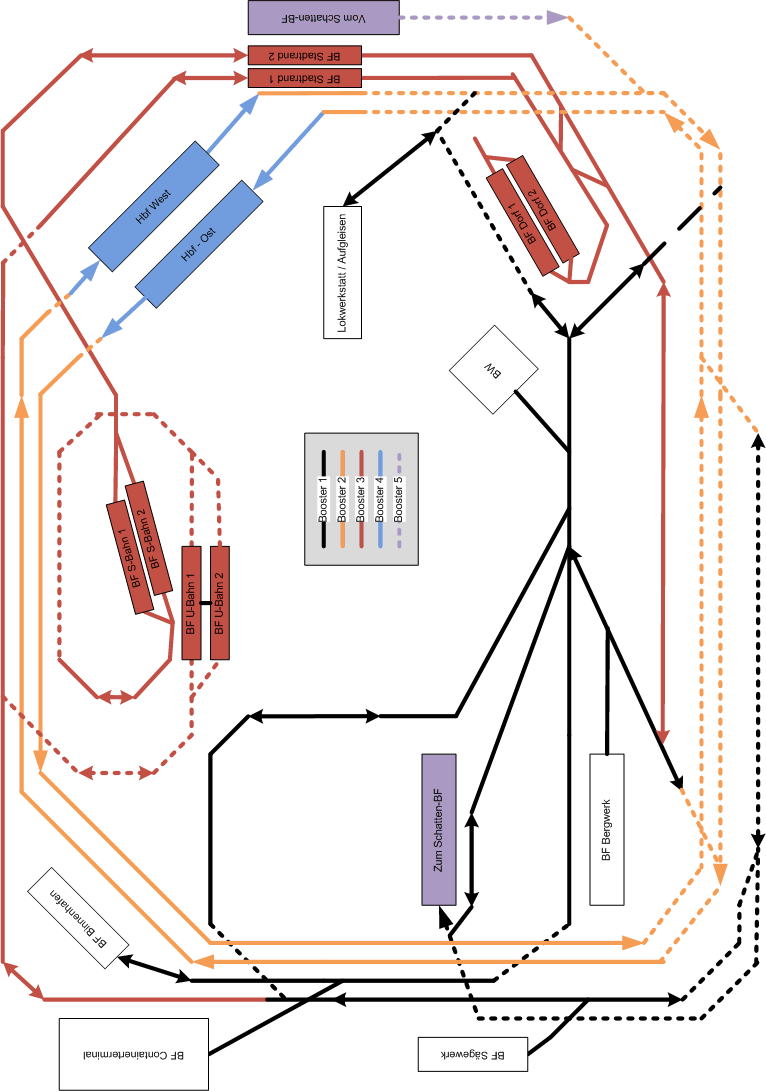 Die Boosterabschnitte auf meiner Zeichnung sind so eingeteilt, dass auf jedem Abschnitt bis zu drei Züge gleichzeitig fahren sollen. Ohne Schattenbahnhof wären das 15 gleichzeitig fahrende Züge max. Für die S-Bahn-Pendelstrecke und die Paradestrecke halte ich das auch für plausibel (wären schon mal 6), die schwarze Nebenbahnstrecke eher 2, Hbf eher 1, Schattenbahnhof da recht groß wieder 3. Wären in Summe damit 12.