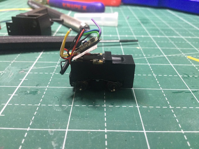 Das habe ich gemacht und dann die Leitungen vom Decoder die an die Schleifer kommen an die Messingplättchen wo vorher der Kondensator drunter steckte und auch die Motorleitungen angelötet waren.