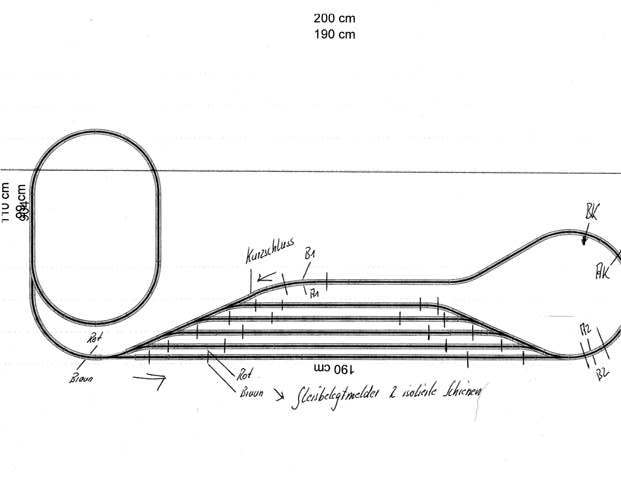 Es soll nicht werden, dass an dieser Stelle der Gleisplan angepasst wird. Ich sage nur, einen (Schatten-?) Bahnhof hätte ich nicht innerhalb der Kehrschleife projektiert, sondern 2 parallel geführte Stränge mit z.B. je 3 Gleisen vorgesehen. Was dann mit dem <Hundeknochen> an den beiden Ein-/Ausfahrgeleise weiter passiert, das kann auch aus jeglicher Fantasie entspringen. NUR gäbe es dann übersichtlichere Stromkreise. Dies ist so wichtig zum anlegen der Stromlosen Halteabschnitte (mal gar in ganzer Zuglänge). Interferierende Weichen -zwischen diesen 2 Stränge würde ich MANUELL zuschalten bei gleichzeitiger Zu-/Abschaltung der direkt angrenzenden Stromkreisen. So gewinnt man den Vorteil -eigene Ansicht, die Anlage alternativ und beliebig in einen Automatikbetrieb oder in einen Spiel-/Rangierbetrieb versetzen zu können. Bei geeigneter Spannungs-Einspeisung lassen sich sogar abschnittweise beide Varianten zu gleicher Zeit einstellen. Da kommen streng geordnete Stromkreise gut an... Grundsätzlich dreht sich alles um DIESE KREISE!