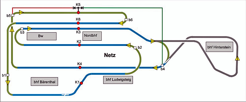 bahnhöfe haben in beiden richtungen ein- und ausfahrten. zugverkehr in den bahnhöfen findet nur manuell statt. das allerwichtigste auf der anlage ist der gleisplan, bei dessen planung alle denkbaren betriebsvarianten berücksichtigt wurden.