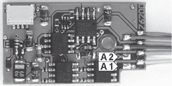 Zusätzliche Sonderfunktionen wie Rauchgenerator, Telexkupplung oder eine Führerstandsbeleuchtung können an die Sonderfunktionsausgänge A1 und A2 angeschlossen werden. Die Zuleitung des Verbrauchers wird direkt an die Decoderplatine angelötet. Die Rückleitung wird entweder mit dem schwarzen Kabel des Decoders oder mit dem Lokchassis (Masse) verbunden."