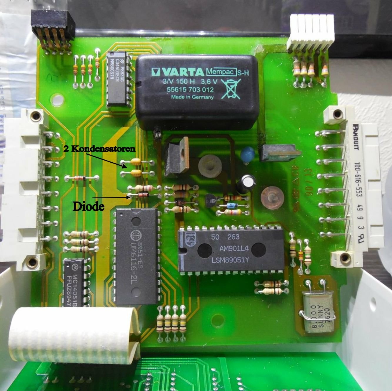 jetzt wird es haarig. Auf der Platine ist der RAM 6116 eingebaut. Von seiner Kerbe aus nach oben (Bild) befinden sich 4 Bauteile. In der Reihenfolge Diode, Widerstand, Kondensator, Kondensator. Der erstgenannte Kondensator könnte einen Feinschluß haben so dass er den Akku langsam leerlutscht. (die Kondensator-Vermutung ist nur Spekulatius)