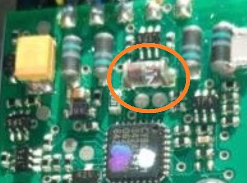 schau mal die querliegende Diode oben, unter dem gelben Kabel genau mit der Lupe an.