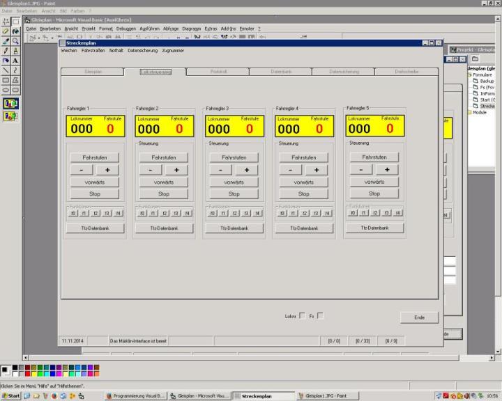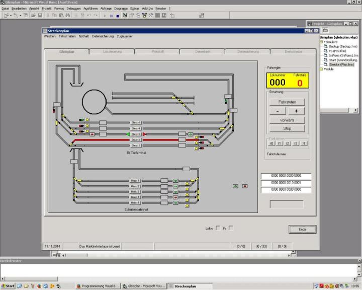 Ich programmiere seit Jahren in VB . Aktuell in VB 2008 . Die Gleispläne erstelle ich aus einzelnen *.gif Bildern ,die ich mit Microangelo erstellt habe .Die Lade ich in Pictureboxes.Für jedes Gif gibt es 4 Möglichkeiten Bild(sw).gif ,(rt),(gn),(gb). SW = Gleis frei, rt = Gleis belegt , gn = Fahrstrasse eingestellt , gb = Rangierfahrstrasse . Die Gifs werden dann im Programm hochgeladen .