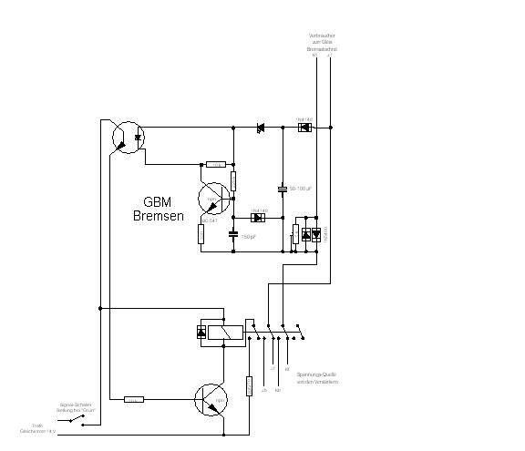 Der Bremsgenerator sendet den Bremsstrom ist klar . Und der Fahrstrom , wo kommt der her im Bremsabschnitt , von den normalen Abschnitt und der wird mir hilfe des Relais umgeschaltet ? Richtig ? Wie schalte ich das denn nun . Möchte mit ein normalen Schalter ein Signal Schalten(noch nicht vorhanden) , mit dem Signal wird denn der Bremsgenerator entsprechend (rot , grün ) geschaltet . Hast du ein Schaltplan ?