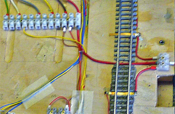 3er Lüsterklemme, links u. rechts je ein Leiter, mit Messing-Streifen, zum Gleis,