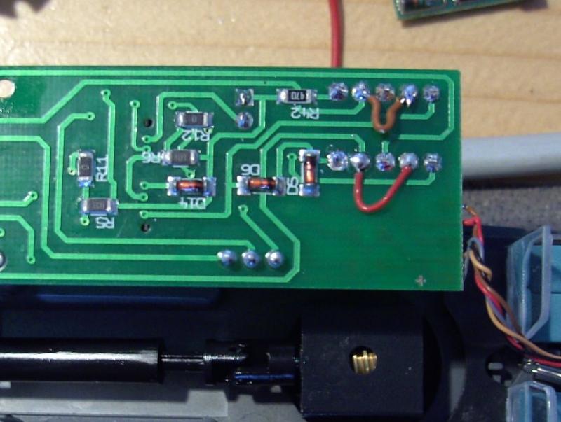 die haben ein Relais eingebaut, das so geschaltet wird, dass immer nur der vordere Steuerwagen den Strom aufnimmt. Das soll verhindern, dass der Zug vor stromlosen Abschnitten nicht rechtzeitig zum Halten kommt. Da ich sowieso über Computer fahre und keine stromlosen vor den Signalen habe, habe ich am Relais Brücken gelötet. Jetzt nimmt der ganze Zug Strom auf und bleibt nicht mehr stehen.