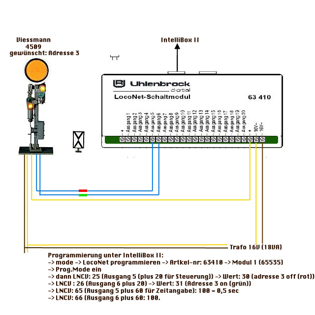 ich hoffe, einige von ihnen kennt sich mit der Programmierung des Uhlenbrock IB2 und Schaltmodul 63410 gut aus. Da ich der Anfänger bin, lerne ich die Programmierung. Seht ihr bitte die Zeichnung an, was ich mir wünsche: Ich möchte den Vorsignal von Viessmann 4509 auf Adresse 3 stellen, als die Kabel zu Modul 63410 Ausgang 5 und 6. (Der Signal zeigt die Scheibe nach vorne = bedeutet Langsamfahrt (off) und nach hinten = bedeutet Freifahrt (on)).