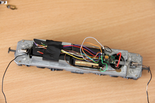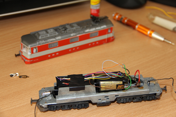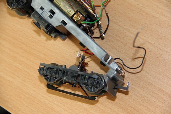 Schnell war der Schliefer unter der Lok verstaut und die Kabel angeschlossen. Einen ersten Versuch meisterte die Lok bravurös. Da die Limalok wahrschienlich länger nicht lief, stand sie zwischenzeitlich auf dem C-Gleis bockstill. Nach der Reinigung der Schienenabschnitte lief sie auch dort ohne Probleme. Allerdings will sie nicht über Weichen fahren. Irgendwie erhält die Lok keinen Strom. Kann das an den Radkontakten liegen?