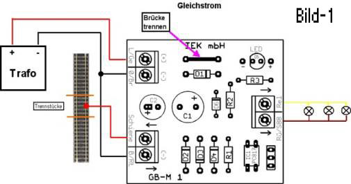 (Bei Gleichstrombahnen muß zwingend der Schienenstrang unterbrochen werden, an dem der Minuspol des Fahrtrafos angeschlossen ist!!)