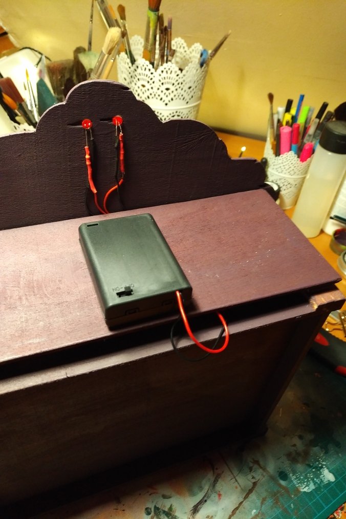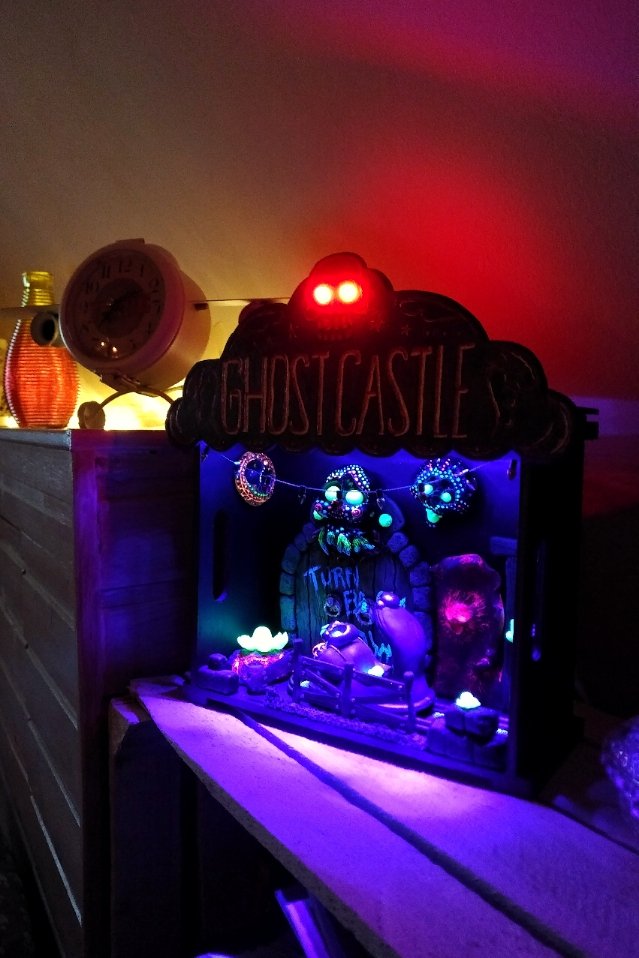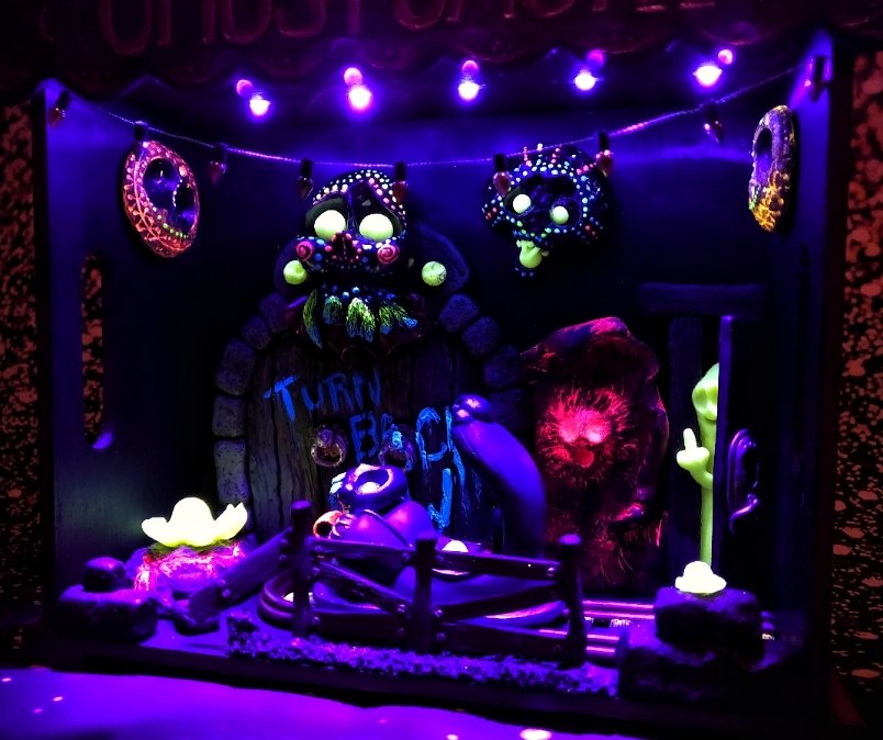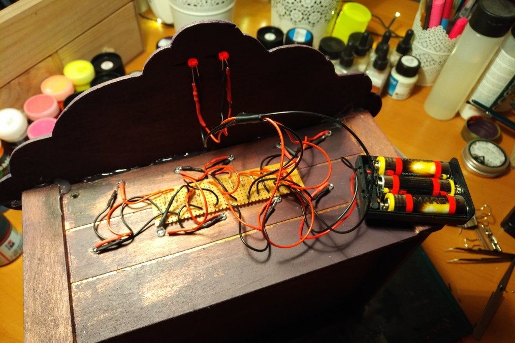 Ich habe bereits einige Jahren angefangen, zu modellieren (Super Sculpey). Ich möchte jedoch mein Diorama mit Led ausstatten und zwar mit 10 UV-Led (3,9 V, 20mA). Mit 3 1,5V Batterien, dafür braucht man ja nur 33 Ohm Widerstand bei Parallelschaltung. Ich habe versehnlich 10 angefertigen Led mit Widerstände bestellt (bereits gelötet und mit Schrumpfschlauch befestigt. Die sind für 12V gedacht und sicher mit hohen Widerstände.