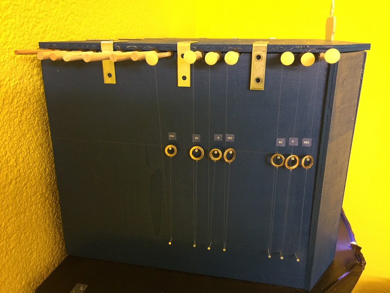 Das ist die Seitenansicht. In dem Kasten hängen die Hintergründe an den Stangen und über die Seile außen kann man die Hintergründe runter lassen.