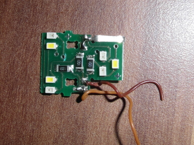 Da der Wagen (und damit die Platine) für analoge Lichtumschaltung über Polaritätswechsel der Spannung gebaut wurde ist ein größerer Umbau der Platine notwendig. Warum? Nun weil die gelben SMD-LED für den Anschluß an einen Decoder falsch herum eingebaut sind. Darum müssen diese zuerst abgelötet und um 180° gedreht wieder angelötet werden. Genaueres dazu findest Du hier: klick mich