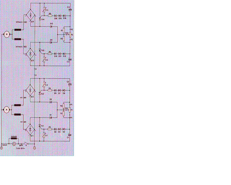 Ich habe hier eine ältere Schaltung aus dem MM 3/88. Diese Schaltung soll zum Steuern des Märklin Kranes 7051 hergenommen werden, mittels Joystick. Der Clou ist halt, das die zwei Motoren des Kranes nicht nur angesteuert werden können, sondern auch die Drehzahl geregelt werden kann. Es geht also um das feinfühlige Steuern... Angeschlossen werden soll die Schaltung laut Bericht an ein Kreuz-Steuer-Potentiometer.