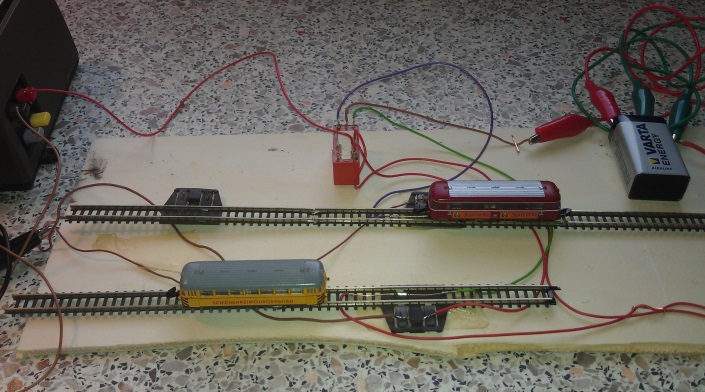 Ich bin erstmal dabei einen "Versuchsaufbau" zu machen. Im Anhang sieht man auf dem Foto den roten Schienenbus der in den Bahnhof hineinfährt. Im Gleis ist ein Reed Kontakt und ein Magnet ist an der Lok. Kommt nun die Lok zum Reed Kontakt, wechselt die Schienenspannung vom oberen ins untere Gleis und schickt den gelben Schienenbus auf Tour.