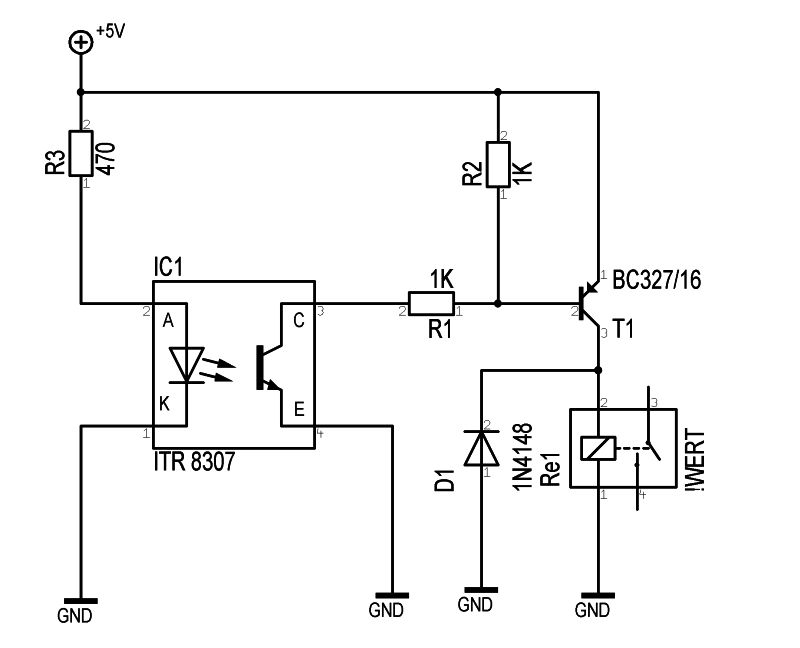 ich habe günnis Schaltung mal etwas optimiert. Die Einstellung der Empfindlichkeit ist meiner Meinung nach nicht nötig, da die Lichschranke sowieso sehr stark auf Umgebungslicht (Infrarot) reagiert. Wenn ich mir das Datenblatt so anschaue, dann ist der maximale Schaltabstand bei etwa 3mm erreicht um noch sicher etwas zu erkennen (Spiegel). Die Schaltung wird also nur im Dunkeln (Schattenbahnhof) sauber funktionieren. Beachte auch die richtige Beschaltung der Lichtschranke. Pin 1 -> Kathode, Pin2 -> Anode, Pin 3 -> Kollektor, Pin 4 -> Emitter. Der Transistor ist ein pnp-Typ (EBC) mit einer Stromverstärkung von typisch 160. Das sollte reichen um das Relais sicher anzusteuern. Das Relais ist nur ein Beispiel da ich nicht weiß welches Du verwendest.