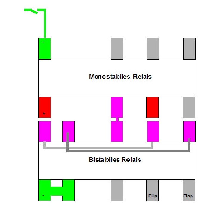 Wie oben erwähnt, ich habe eine Schaltung aufgebaut, die mit 2 Relais und nur EINEM Taster einen Stromstoßschalter "überflüssig" macht, bzw. deiner Nachfrage entspricht.