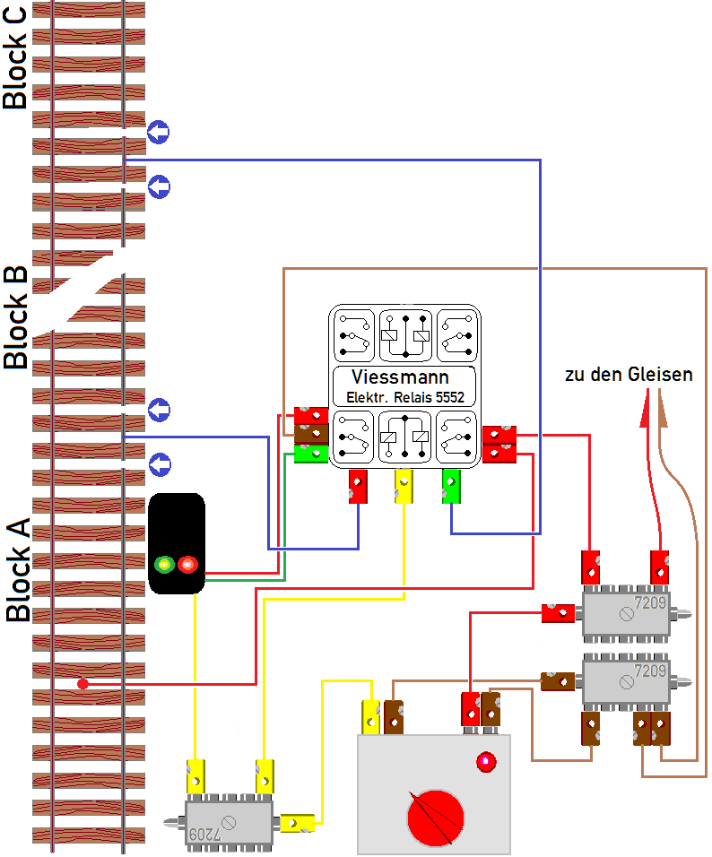 Jetzt habe ich mal ein bisschen gemalt. Der Trafo versorgt mit Lichtstrom das Signal und das Viessmann-Relais 5552. An einem Umschalter werden die Rückleiter des Signals für Grünes und Rotes Licht angesteckt (Am Relais linke Seite unten). Am dazugehörigen Umschalter der Fahrstrom vom Trafo und die Leitung in den Halteabschnitt (Am Relais rechte Seite unten). Verlässt nun ein Zug den Block A, schließt er beim Überfahren der folgenden Trennstelle den Stromkreis, das Relais schaltet um: Signal zeigt rot, der Fahrstrom ist unterbrochen. Verlässt nun der Zug auch Block B, löst er an der dortigen Trennstelle die umgekehrte Schaltung aus: Das Signal zeigt wieder grün, der Fahrstrom ist eingeschaltet.