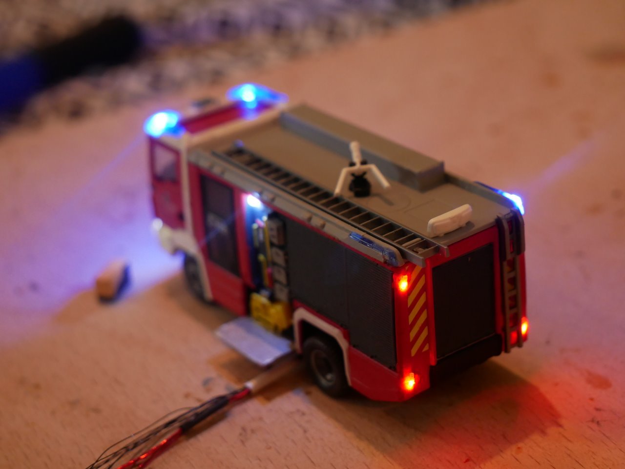 Das HLF ist tatsächlich mein erstes Modell mit "Inneneinrichtung" und so einer aufwendigen Beleuchtung. Zwar hatte ich in andere H0-Fahrzeuge schon Blaulicht oder Warnblinker oder normales Licht eingebaut aber noch nie alles zusammen in ein Fahrzeug...