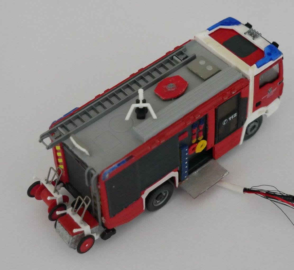 inzwischen habe ich noch ein paar Details ergänzt (insbesondere vorne und auf dem Dach). Die Außenspiegel fehlen immer noch, sehe ich gerade... Außerdem hab ich eine Schlauchhaspel und eine Haspel mit einer "Metallkiste" (Eigenbau) hinzugefügt. Ich glaube, im Original verbirgt sich dahinter ein Lüfter.