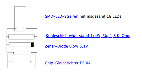 Mein Problem: Ich habe die Schaltung wie oben beschrieben zusammengelötet (in derselben Reihenfolge) und testweise an den Profi-Boss angeschlossen. Die LEDs haben geleuchtet. Dann wollte ich testen, ob der Brückengleichrichter funktioniert, und habe den Anschluss umgepolt, die beiden Digitalkabel, die aus dem Profi-Boss kommen, also umgedreht. Seitdem ist der LED-Streifen "tot", und auch meine zusammengelötete Schaltung habe ich offensichtlich "gegrillt".