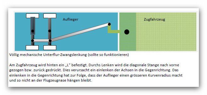 hm, interessante Idee - und gar nicht so abwegig. Es gibt beim Vorbild einsachsige Sattelauflieger, deren Achsen auf ähnliche Weise angelenkt werden, um die Fuhre wendiger zu machen. Zu den Fragen:
