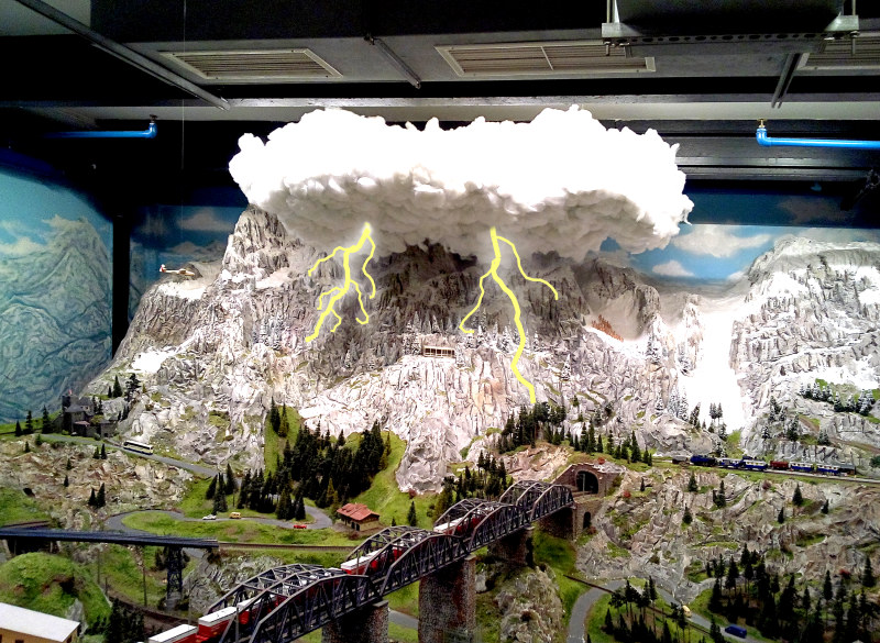 Seit kurzem gibt es die bedrohliche Gewitterwolke im Österreich-Abschnitt (siehe Foto). In Verbindung mit der schon seit Längerem bestehenden Knopfdruck-Aktion Donnergrollen macht das in der Wunderland-Nacht eine wirklich imposante Stimmung. Im Wochenbericht 941 wird Herstellung, Transport und Montage beschrieben. Was mich mal interessiert ist das Material, woraus die Wolke geformt worden ist. Brenn- und leicht entflammbar darf das Material ja nicht sein.
