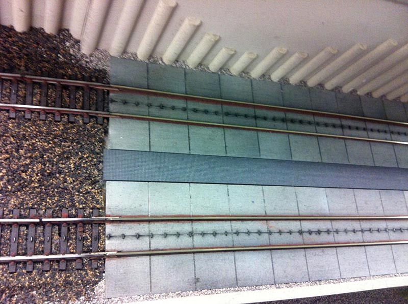 Wir haben in Kunststoffplatten die Schienenrillen und die Plattenfugen von oben und die Öffnungen für den Mittelleiter von unten einfräsen lassen. Dann wurden die Schienenprofile und der Mittelleiter in die entsprechenden Öffnungen eingeschoben, die Platten gealtert und das Gleis war fertig.