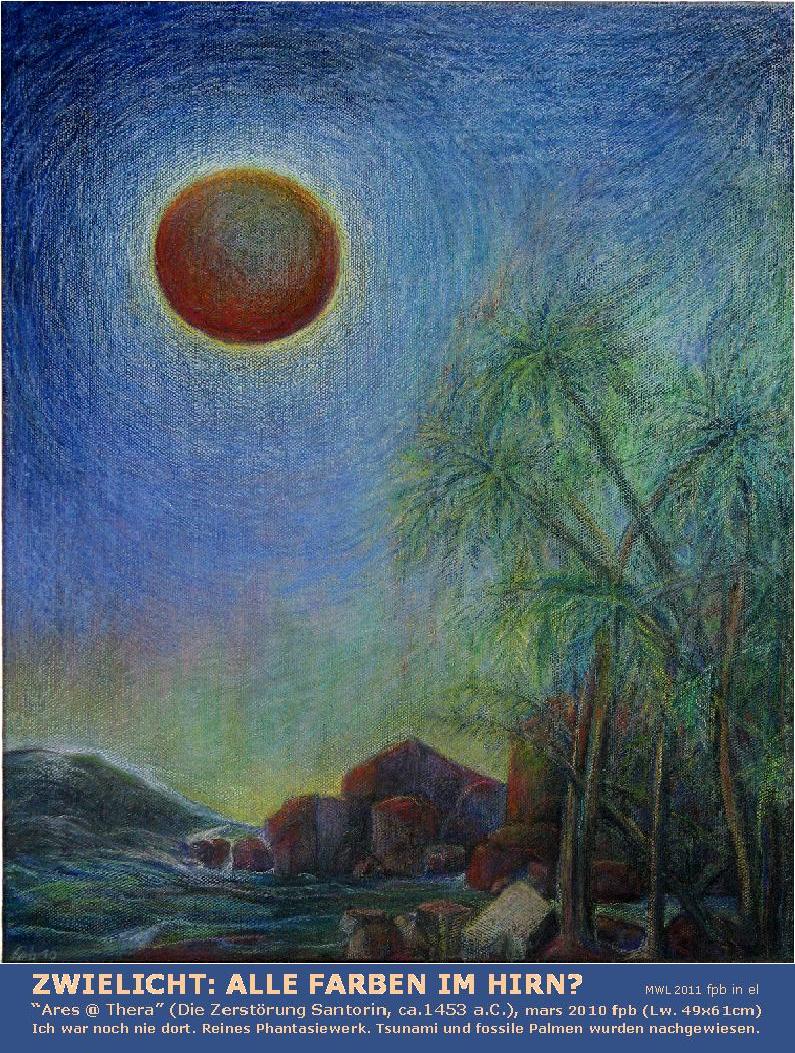 Auf alle Fälle: der Weissabgleich ist nicht dem Photographen allein vorbehalten. Im Anhang versuche ich dies mit 2 Gemälden zu beschreiben, die jeweils den Tag im Zwielicht zeigen. Male einen Mond im ersten Bild und über den Mars im zweiten: der Tag ist nun wie die Nacht. Magie...