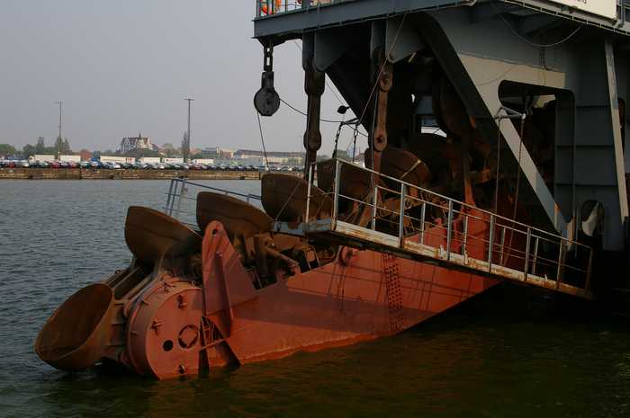 Vorteil der Eimerkette dürfte wohl sein, dass der Sand ohne großen Kraftaufwand in einzelnen Portionen aufgenommmen werden kann. Der Nachteil ist, dass immer etwas daneben fällt, dass dann wohl irgendwann manuell aufgenommen werden muss.
