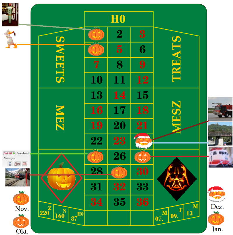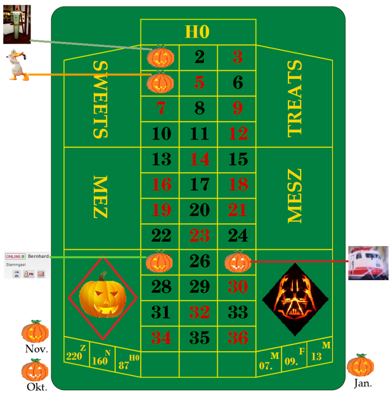 Die Tischdecke ist auch schon fertig, und wie üblich, der aktuellen Jahreszeit angepasst. So, und jetzt ran, zögert und zaudert nicht, sonst stehen wir morgen wieder da wie Hein Blöd, weil über Nacht 500 kC dazugekommen sind.