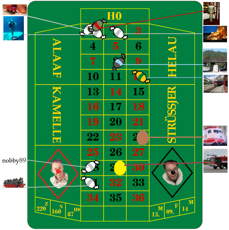 Von den (bisher) 9 Mitspielern haben bisher schon 5 "olle Kamellen" gesetzt, das heißt, sie sind eigentlich schon aus dem Rennen. Siehe Grafik: die "blassen Bonbons" sind über das MHD. Da der Zähler zur Stunde aber erst bei 14.720.865 steht, wäre ja noch knapp dreißigtausend Clicks Zeit, die Süßwaren diskret umzudisponieren oder gegen Nougateier einzutauschen.