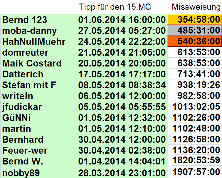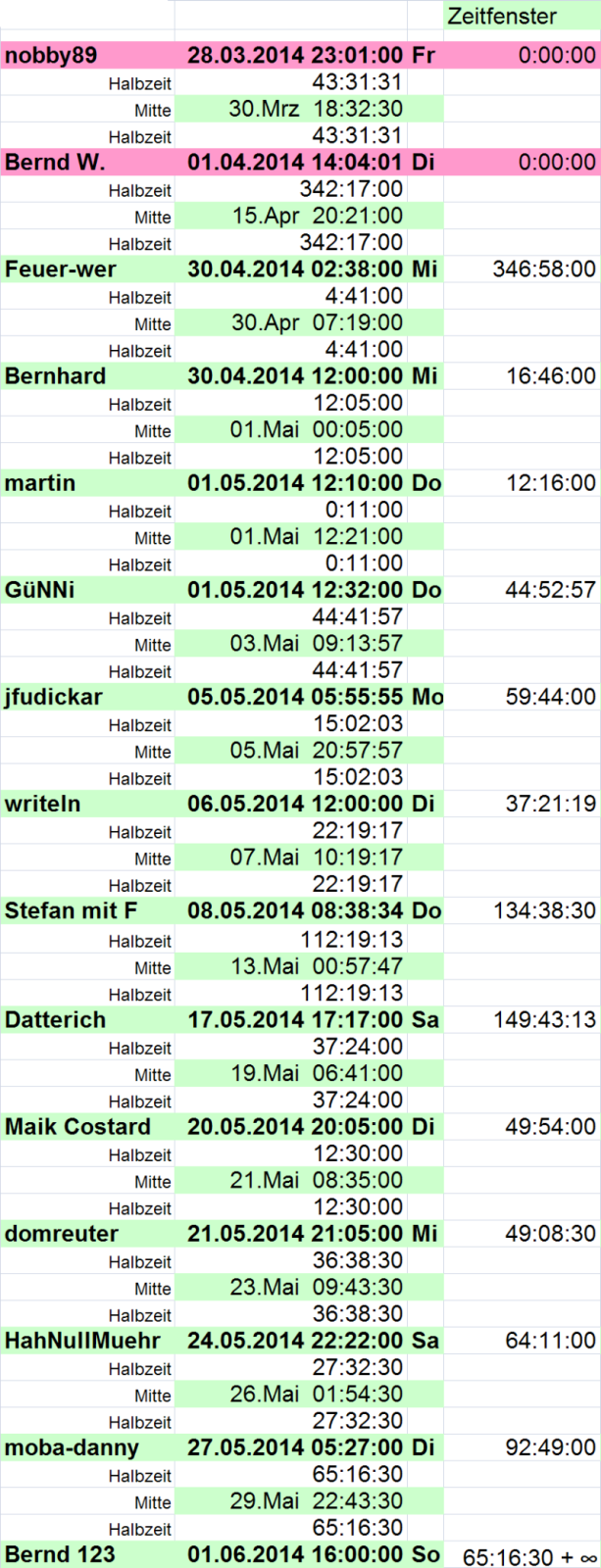 , dass zwei der fünfzehn Teilnehmer bereits quasi in der Aufwärmrunde ausgefallen sind. Das heißt, noch liegt Bernd W. in Führung, mit einem satten Zeitpolster von um die 160 Stunden.