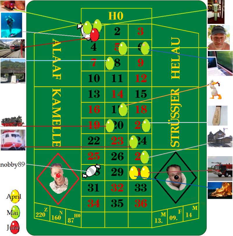 Und so sieht nun das endgültige Tableau aus:Die "ollen Kamellen" (etwas über das MHD) sind noch auf dem Tisch. Alle gültigen Ei-sätze sind farbig gemalt, je nach Monat (siehe unten links).