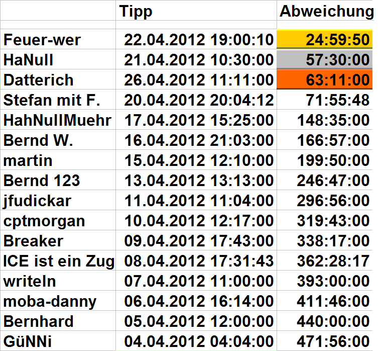 Abschließend noch die Tabelle, geordnet nach der gemessenen Miss-Weisung (in hh:mm:ss).