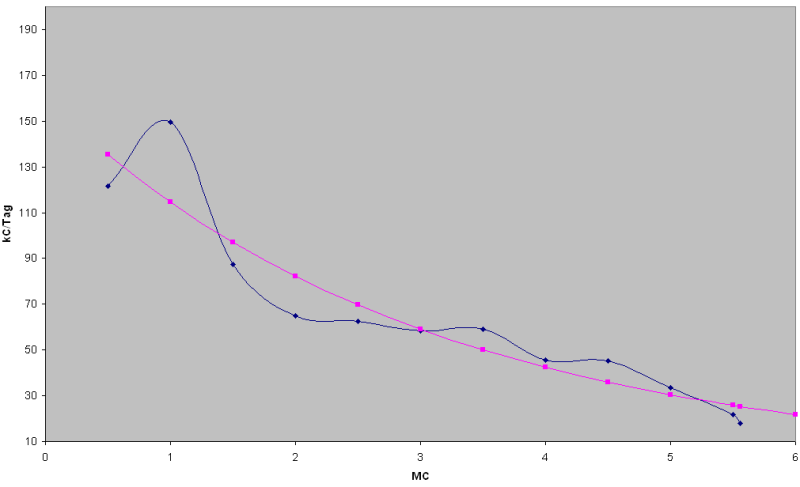 Wie Sie sicherlich sofort alle erkennen, haben wir eine Exponentialfunktion nach der Methode der kleinsten Quadrate an die bisherigen fünf Millionen Fünfhundertachtundfünfzigtausend neunhundertfünfundvierzig Klicks angenähert. Daraus ergibt sich ein Zieleinlauf am