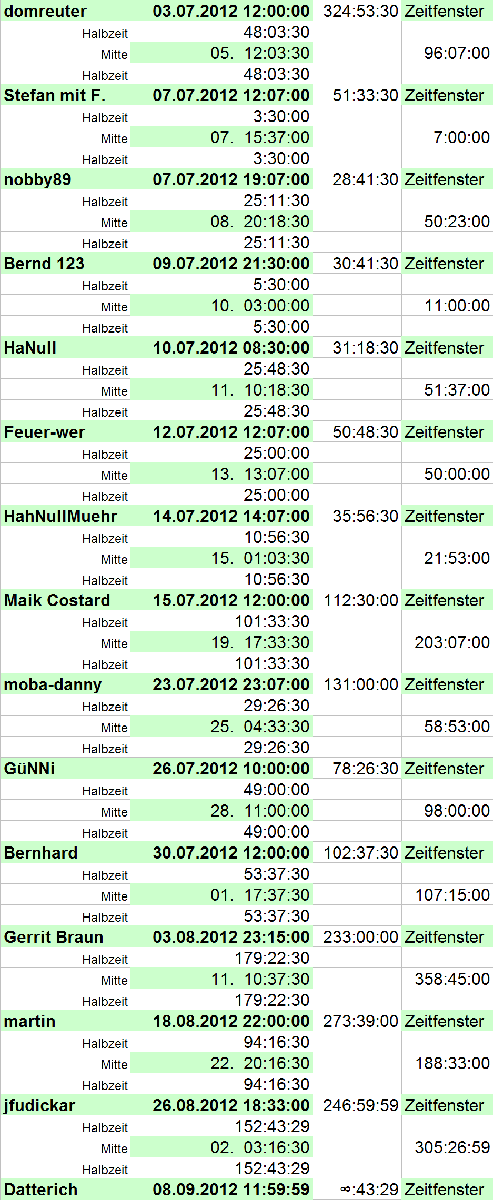 Dicht gedrängt das Feld vor Mitte Juli, danach etwas lockerer, da kommen dann wieder Zeitfenster mit 100 und mehr Stund4en zustande. Aber ob das hilft? Oder haben die sich alle nur verpeilt? Gerrit Braun visiert den 03.08. an und wird mit über 200 Stunden belonht, ebenso alle, die noch später setzten.