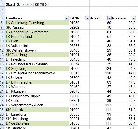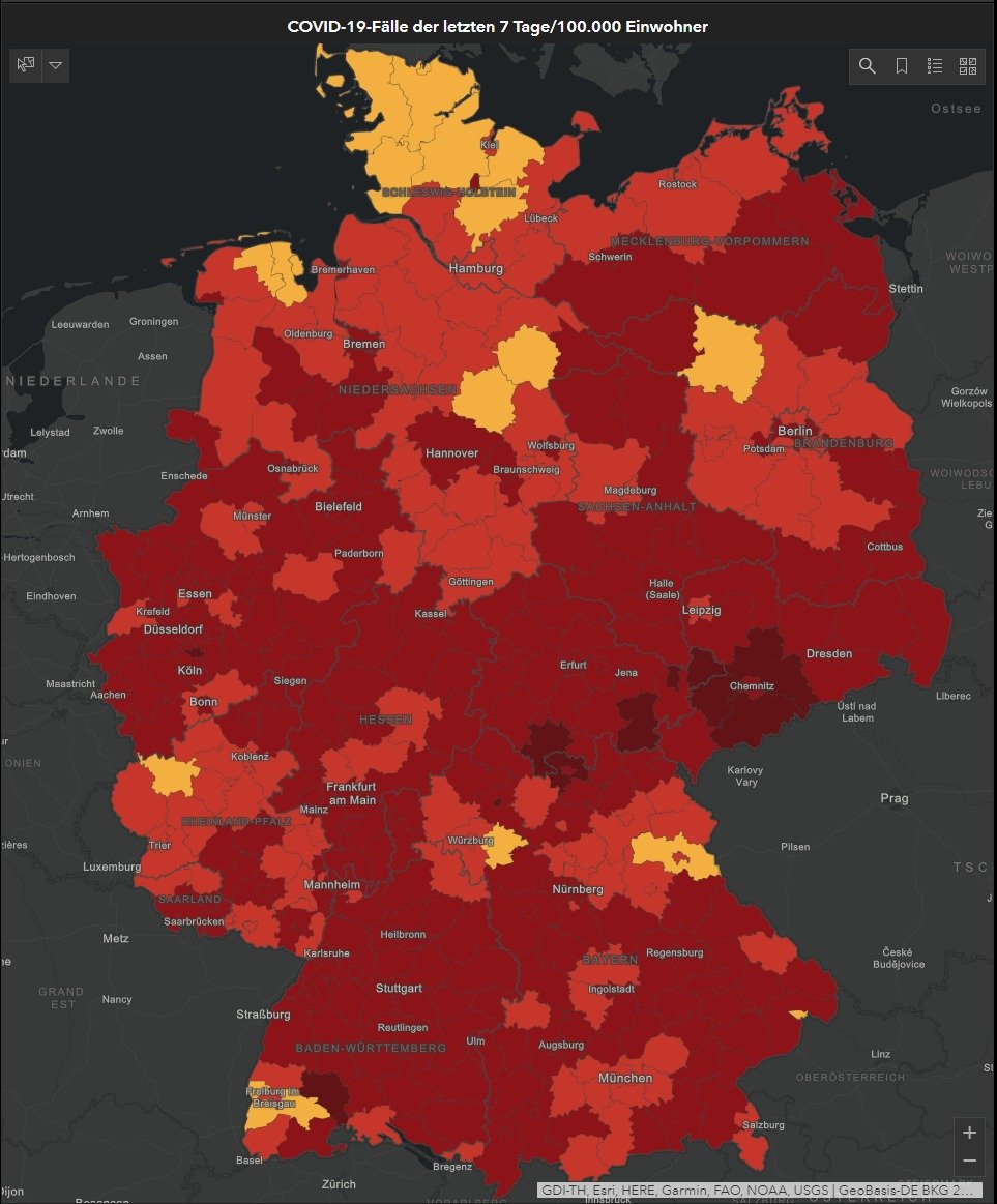 da spielen sicher viele Faktoren mit rein, Bevölkerungsdichte, Mobilitätsverhalten, Infektiösität in Nachbarkreisen, Verantwortungsbewusstsein in der Bevölkerung... hier mal die heutige Karte für ganz Deutschland:Quelle: RKI Die gelben Kreise haben eine Inzidenz bis 50, die hell roten Kreise eine Inzidenz bis 100, die mittelroten Flächen eine Inzidenz bis 250 und die dunkelroten Kreise eine Inzidenz bis 500. Der Saale-Orla-Kreis war gestern noch pink (Inzidenz über 500).Kai Eichstädt hat geschrieben: ↑Freitag 7. Mai 2021, 19:55ich weiß nicht, liegt es an der Meeresluft von beiden Seiten? Kann aber auch nicht, weil in Flensburg die Inzidenzwerte auch schon mal anders waren...