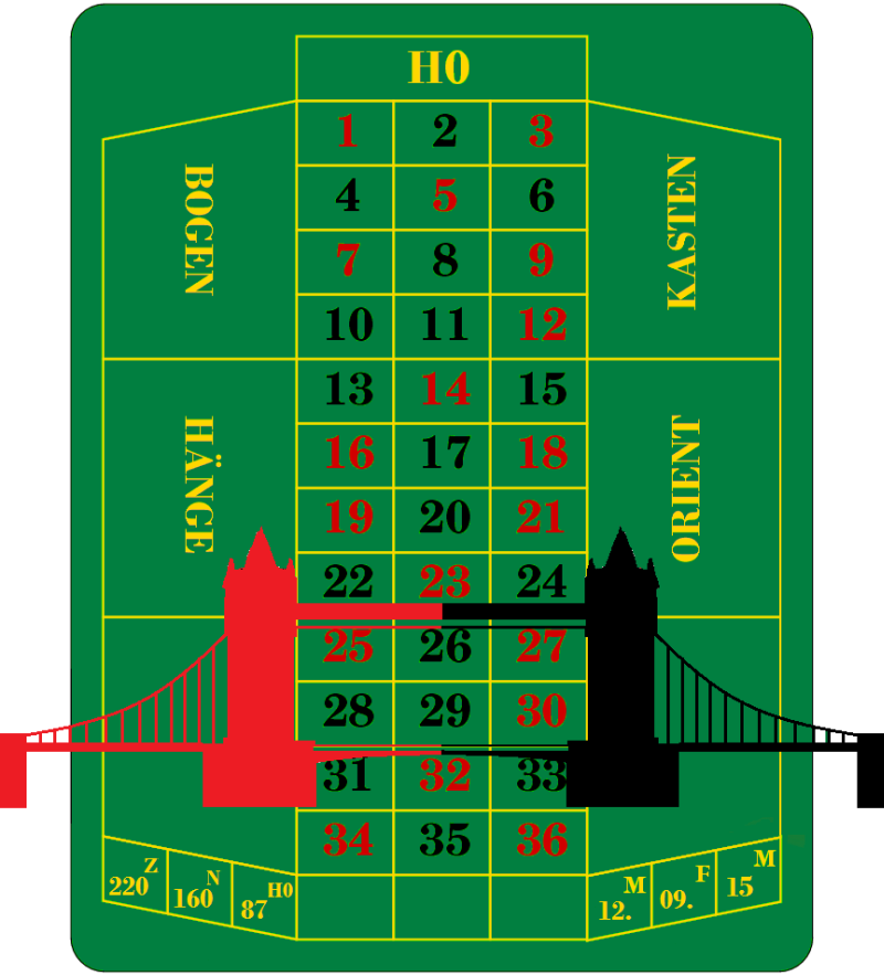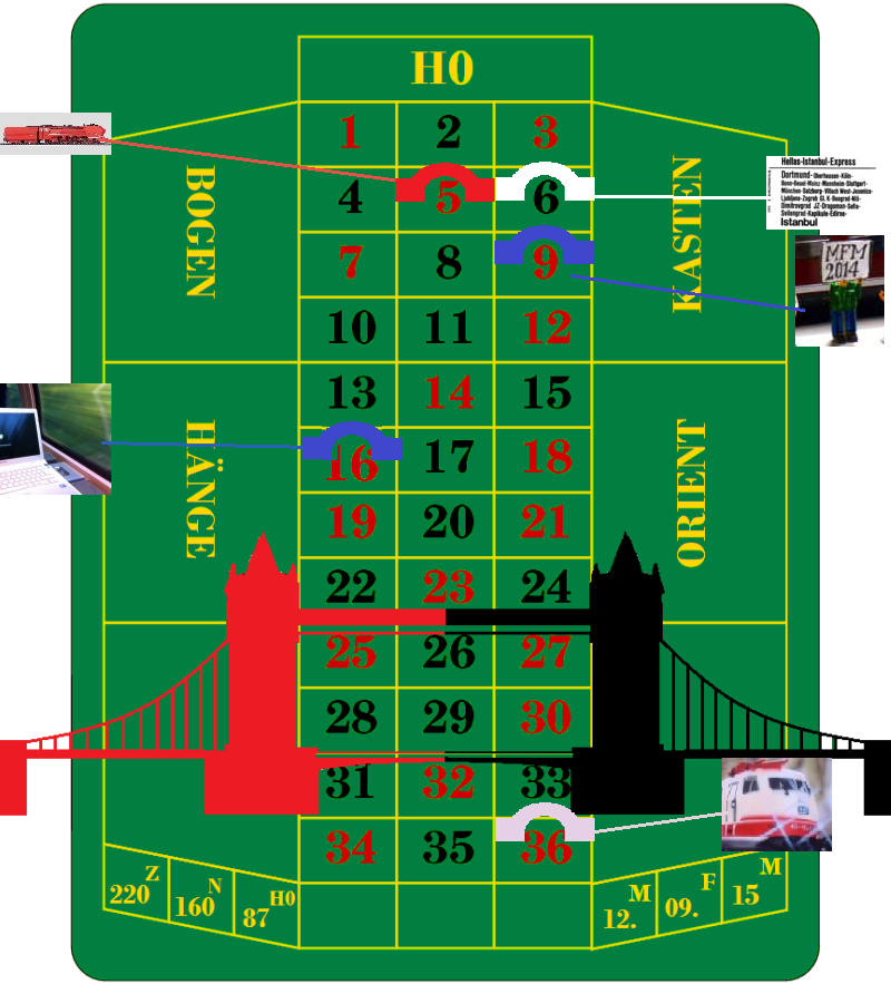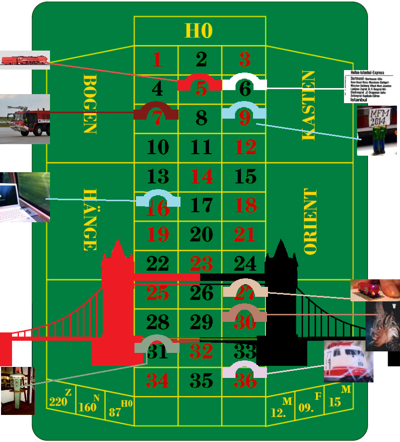 Wieviele Brücken gibt ees im Wunderland? Die Zahlen des Tableaus gelten diesmal hundertfach, wer also meint, es gäbe so um die hundert Brücken, der setzt auf "1", und wer meint, das es etwa 3.600 sind, kann ja auf die "36" setzen. Für andere Zahlen setzt man eben zwei Chips, die dann addiert werden.