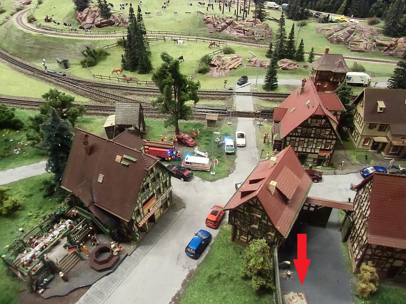 Im Hintergrund an dem Haus, bei dem der gelbe Beetle parkt, links an der Ecke.