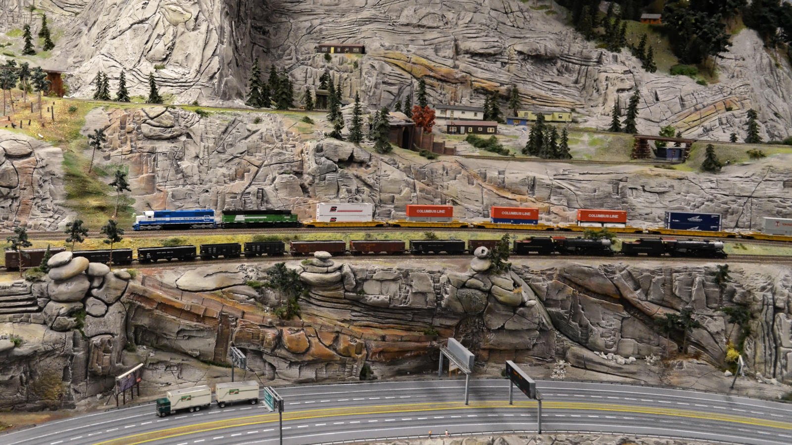 Möglicherweise von der Dampf-Doppeltraktion aufgeschreckt hat er sich später direkt unterhalb derselben nahe dem Highway niedergelassen (auf meinem Foto noch nicht zu sehen). Jedenfalls sehen die dort herumliegenden Felsbrocken der Rocky Mountains denen an denen der Vogel vorbei läuft zum Verwechseln ähnlich.