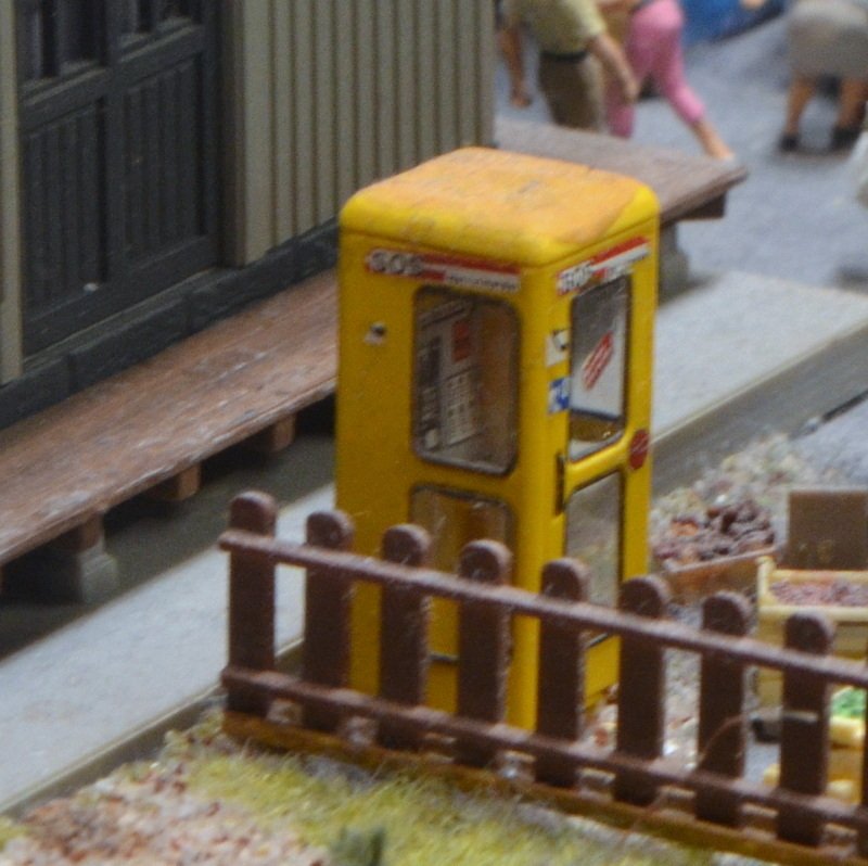 Telefonzelle der Bundespost, deutscher Polizist zur Hälfte zu sehen. Knuffingen?