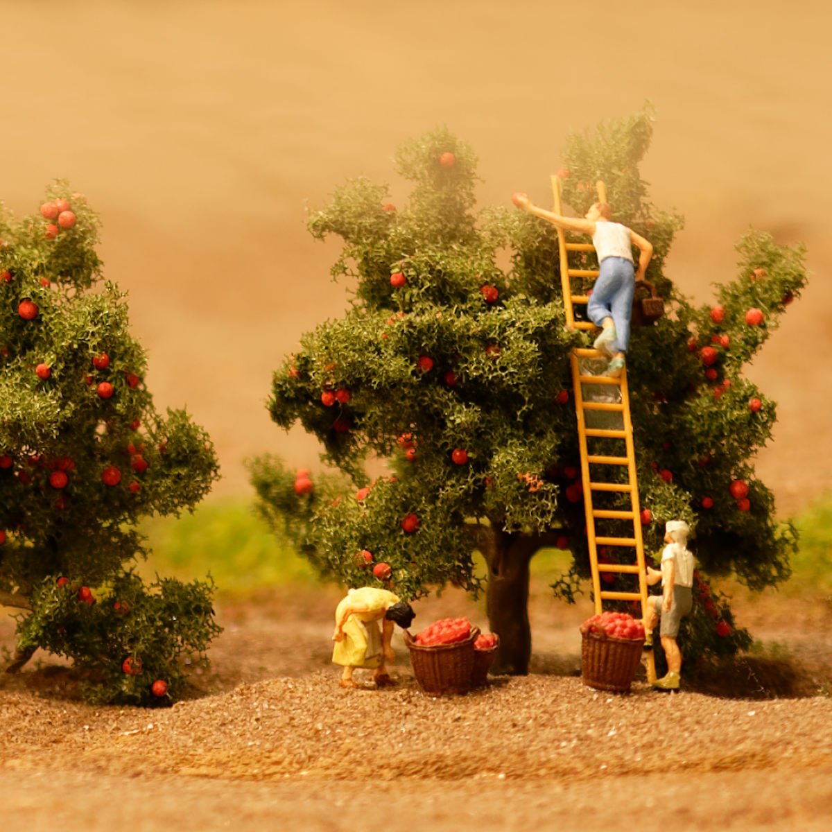 Aber gebt dem armen Mann doch bitte einen Apfelpflücker, dann muss er nicht so lange Arme machen.